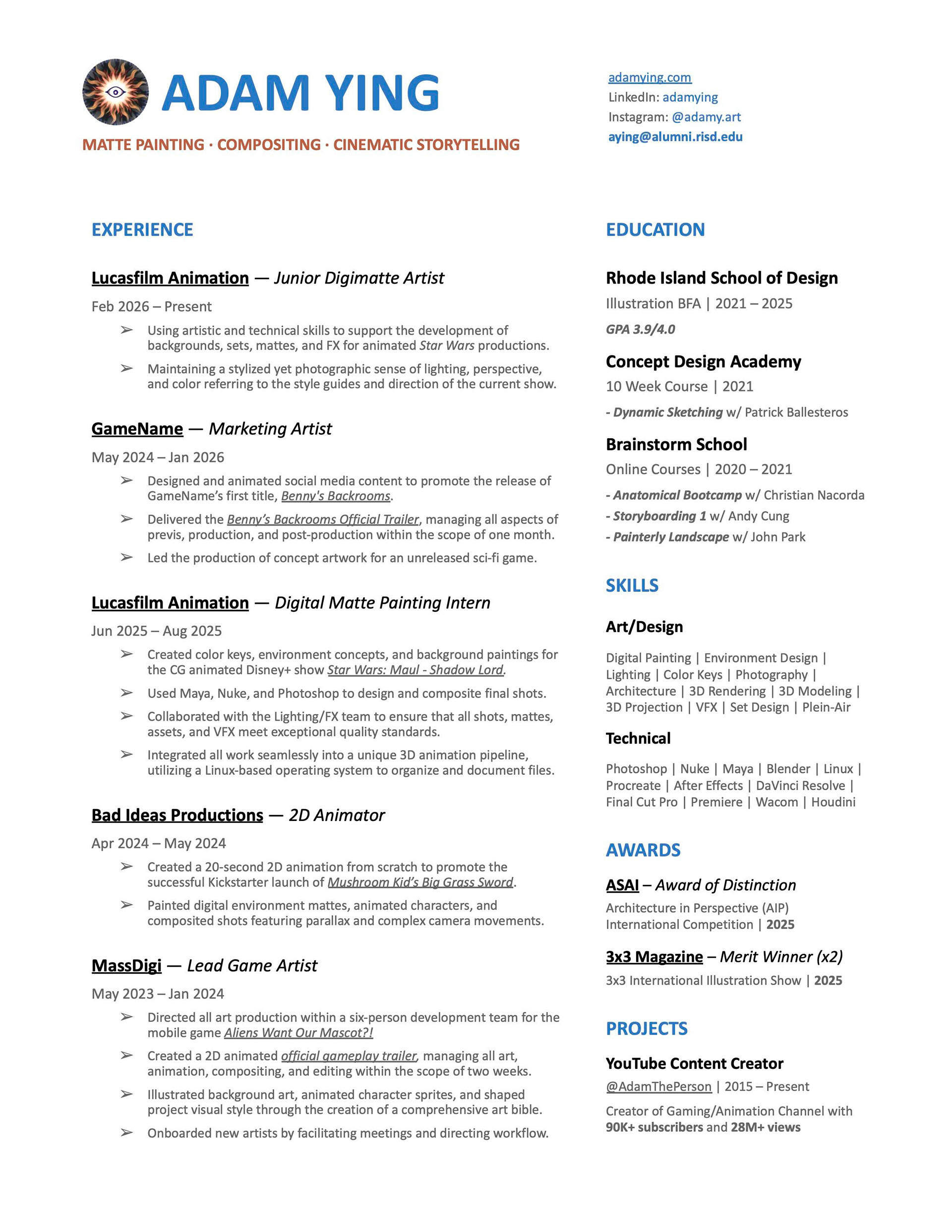 Adam Ying is a professional illustrator who specializes in lighting, color, and animation for games and TV. He is currently a Junior Digimatte Artist at Lucasfilm Animation on the show Star Wars: Maul - Shadow Lord.